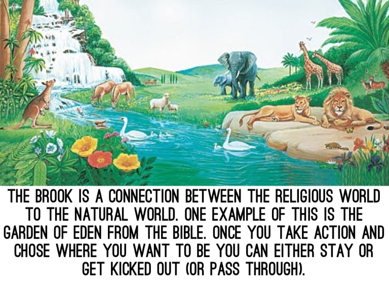 The brook is a connection between the religious world to the natural world. one example of this is the garden of Eden from the bible. Once you take action and chose where you want to be you can either stay or get kicked out (or pass through).