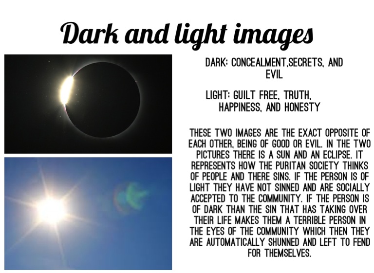 These two images are the exact opposite of each other, being of good or evil. In the two pictures there is a sun and an eclipse. It represents how the puritan society thinks of people and there sins. If the person is of light they have not sinned and are socially accepted to the community. If the person is of dark than the sin that has taking over their life makes them a terrible person in the eyes of the community which then they are automatically shunned and left to fend for themselves.