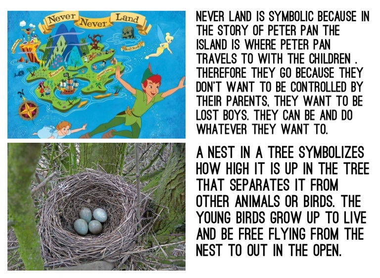 Never land is symbolic because In the story of Peter Pan the island is where Peter Pan travels to with the children . Therefore They go because they don't want to be controlled by their parents, they want to be lost boys. They can be and do whatever they want to.