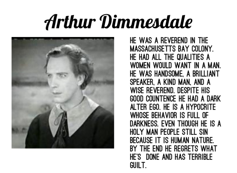 He was a reverend in the Massachusetts bay colony. He had all the qualities a women would want in a man. He was handsome, a brilliant speaker, a kind man, and a wise reverend. Despite his good countence he had a dark alter ego. He is a Hypocrite whose behavior is full of darkness. Even though he is a holy man people still sin because it is human nature. by the end he regrets what he's done and has terrible guilt.