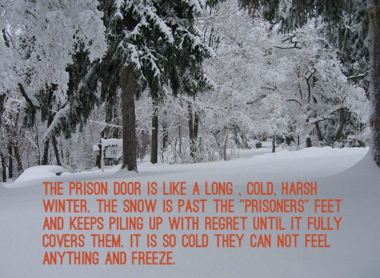 The prison door is like a long , cold, harsh winter. The snow is past the "prisoners" feet and keeps piling up with regret until it fully covers them. It is so cold they can not feel anything and freeze.