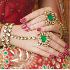 The bride wears a toe ring and a nose ring on her left nostril. She will wear a necklace and heavy earrings. Armlets are worn on the bride's upper arms and anklets are worn at her feet. Bangles, made of both gold and glass, are worn around her wrists. The bride wears 8 rings around her hand, which are connected to a flower or medallion on the upper part of the hand.