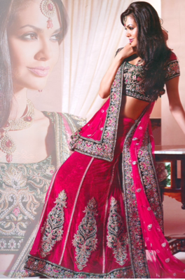 Most brides choose to wear a lehenga, an ankle-length skirt that is usually embroidered with silver or gold and embellished with sequins, stones, and crystals. Brides tend to pair this with a chili, which is a midriff top with tight sleeves. In addition, the brides wear a dupatta or chunni, which are long stoles that drape around the neck and shoulders.
