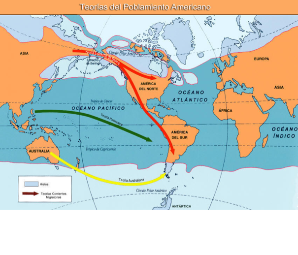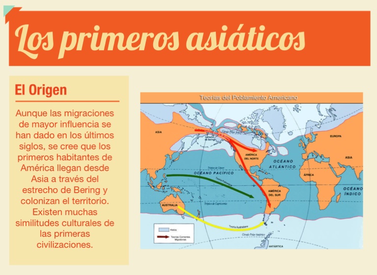 Aunque las migraciones de mayor influencia se han dado en los últimos siglos, se cree que los primeros habitantes de América llegan desde Asia a través del estrecho de Bering y colonizan el territorio. Existen muchas similitudes culturales de las primeras civilizaciones.
