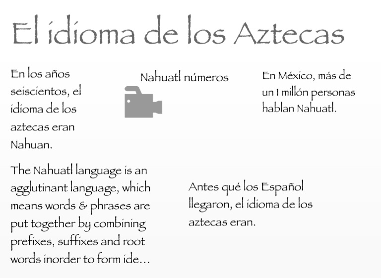 The Nahuatl language is an agglutinant language, which means words & phrases are put together by combining prefixes, suffixes and root words inorder to form ideas.