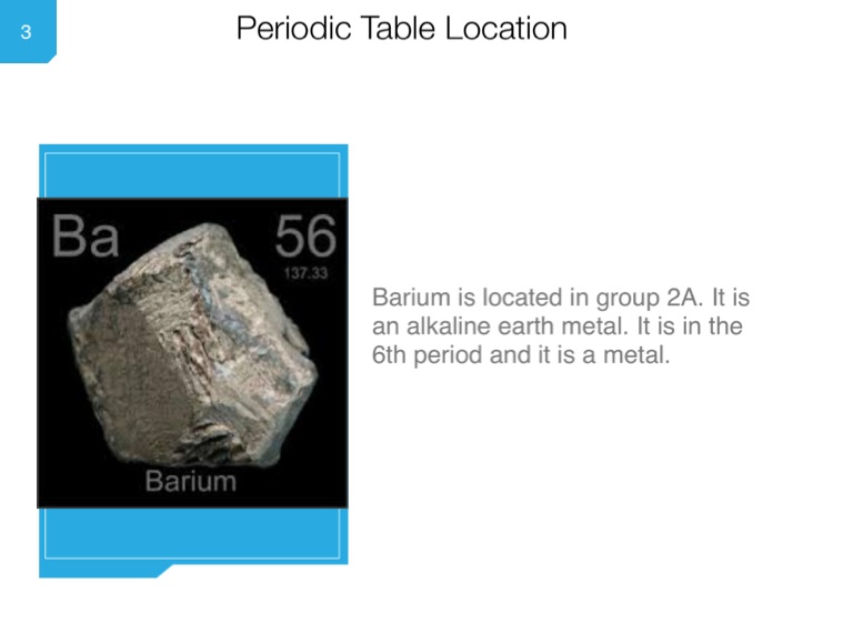 Barium is located in group 2A. It is an alkaline earth metal. It is in the 6th period and it is a metal.