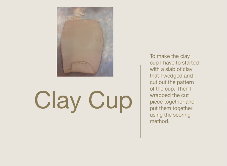 To make the clay cup I have to started with a slab of clay that I wedged and I cut out the pattern of the cup. Then I wrapped the cut piece together and put them together using the scoring method.