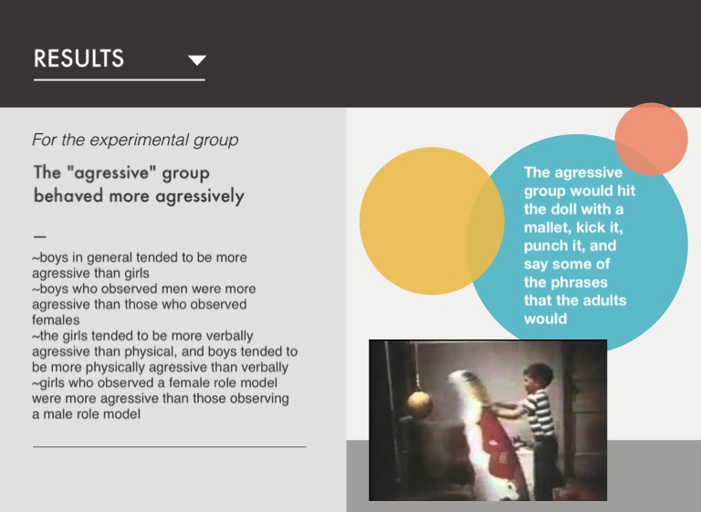 The agressive group would hit the doll with a mallet, kick it, punch it, and say some of the phrases that the adults would