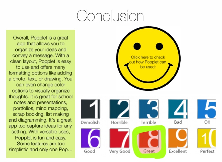 Overall, Popplet is a great app that allows you to organize your ideas and convey a message. With a clean layout, Popplet is easy to use and offers many formatting options like adding a photo, text, or drawing. You can even change color options to visually organize thoughts. It is great for school notes and presentations, portfolios, mind mapping, scrap booking, list making and diagramming. It's a great app too capture ideas for any setting. With versatile uses, Popplet is fun and easy. Some features are too simplistic and only one Popplet board is accessible