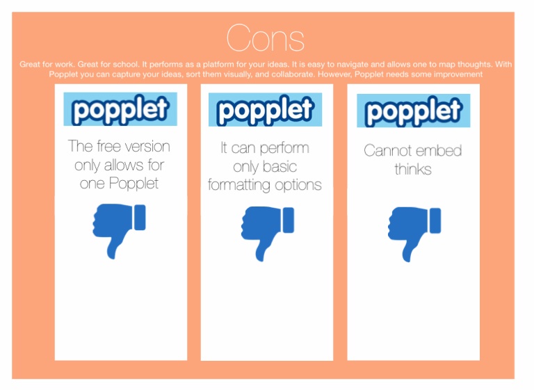 Great for work. Great for school. It performs as a platform for your ideas. It is easy to navigate and allows one to map thoughts. With Popplet you can capture your ideas, sort them visually, and collaborate. However, Popplet needs some improvement