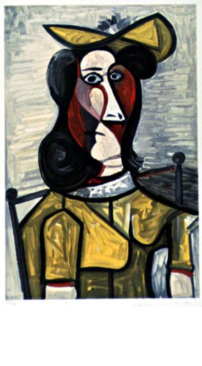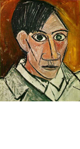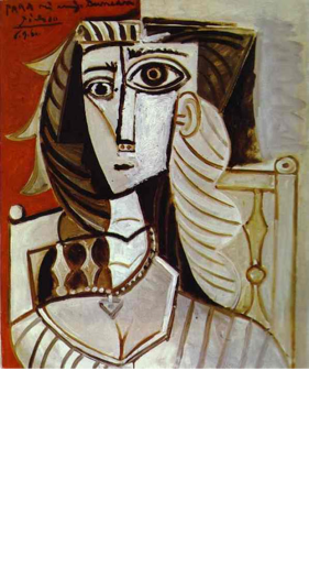 Cubism uses shapes to show more than one perspective at the same time. Here, you can see frontal and profile views.