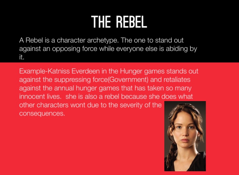 Example-Katniss Everdeen in the Hunger games stands out against the suppressing force(Government) and retaliates against the annual hunger games that has taken so many innocent lives. she is also a rebel because she does what other characters wont due to the severity of the consequences.