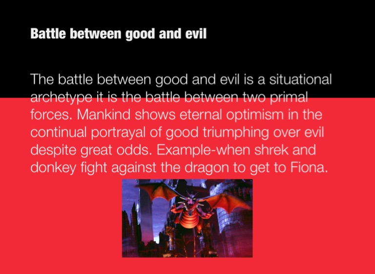 The battle between good and evil is a situational archetype it is the battle between two primal forces. Mankind shows eternal optimism in the continual portrayal of good triumphing over evil despite great odds. Example-when shrek and donkey fight against the dragon to get to Fiona.