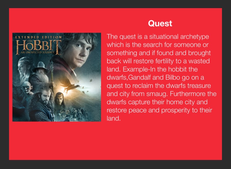 The quest is a situational archetype which is the search for someone or something and if found and brought back will restore fertility to a wasted land. Example-In the hobbit the dwarfs,Gandalf and Bilbo go on a quest to reclaim the dwarfs treasure and city from smaug. Furthermore the dwarfs capture their home city and restore peace and prosperity to their land.