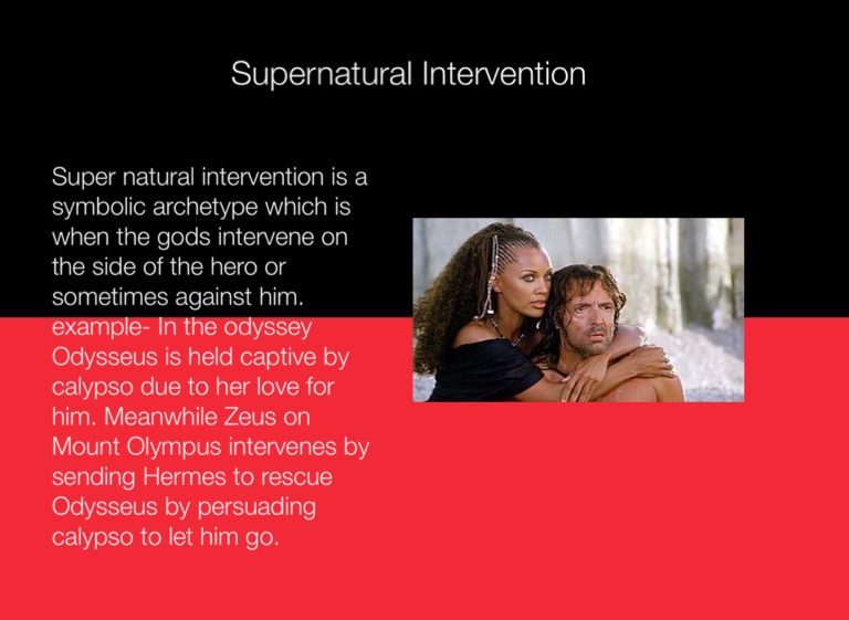 Super natural intervention is a symbolic archetype which is when the gods intervene on the side of the hero or sometimes against him. example- In the odyssey Odysseus is held captive by calypso due to her love for him. Meanwhile Zeus on Mount Olympus intervenes by sending Hermes to rescue Odysseus by persuading calypso to let him go.