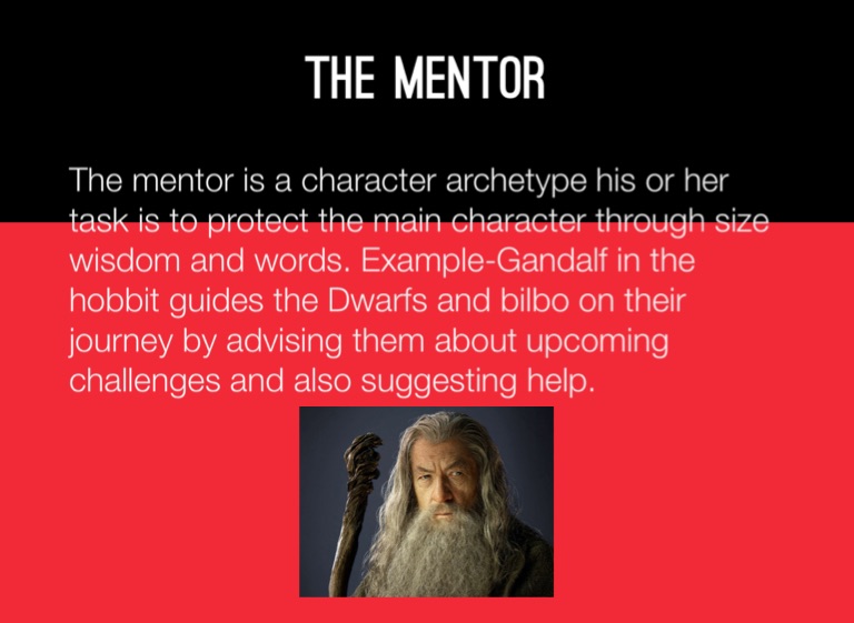 The mentor is a character archetype his or her task is to protect the main character through size wisdom and words. Example-Gandalf in the hobbit guides the Dwarfs and bilbo on their journey by advising them about upcoming challenges and also suggesting help.