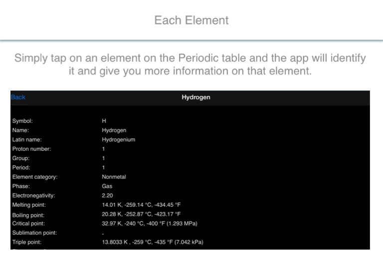 Simply tap on an element on the Periodic table and the app will identify it and give you more information on that element.