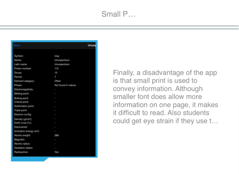 Finally, a disadvantage of the app is that small print is used to convey information. Although smaller font does allow more information on one page, it makes it difficult to read. Also students could get eye strain if they use the app too long.