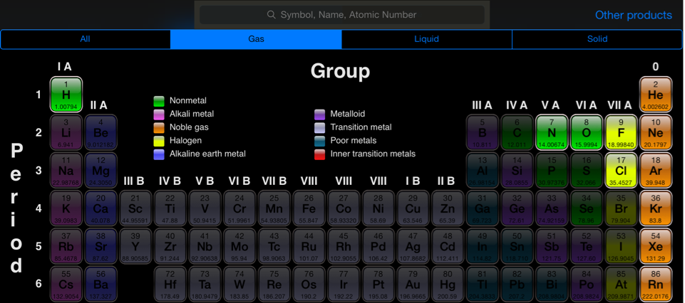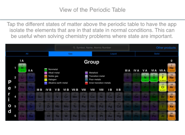 Tap the different states of matter above the periodic table to have the app isolate the elements that are in that state in normal conditions. This can be useful when solving chemistry problems where state are important.