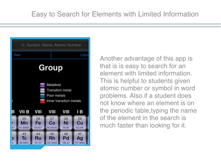 Another advantage of this app is that is is easy to search for an element with limited information. This is helpful to students given atomic number or symbol in word problems. Also if a student does not know where an element is on the periodic table,typing the name of the element in the search is much faster than looking for it.