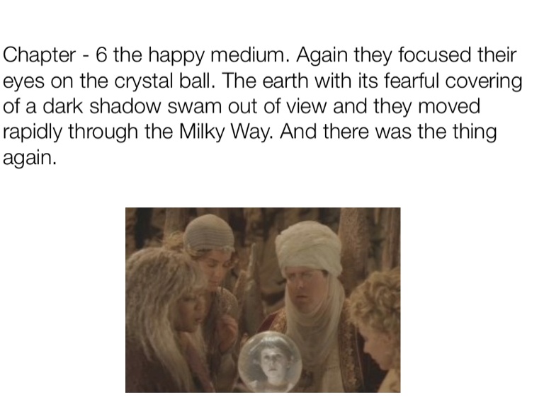 Chapter - 6 the happy medium. Again they focused their eyes on the crystal ball. The earth with its fearful covering of a dark shadow swam out of view and they moved rapidly through the Milky Way. And there was the thing again.