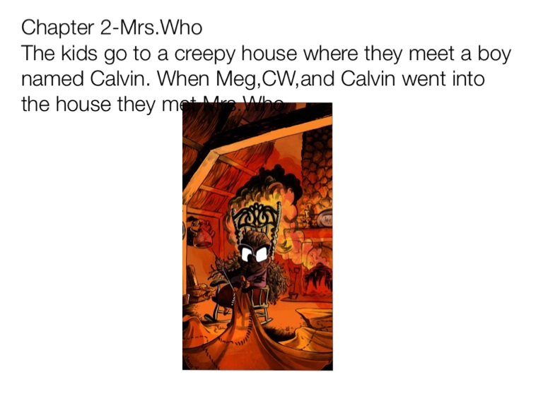 The kids go to a creepy house where they meet a boy named Calvin. When Meg,CW,and Calvin went into the house they met Mrs.Who