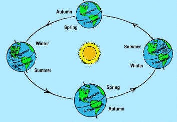 Winter - Winter is the coldest season of the year but its when the earth is closest to the sun (weird right). It's the coldest season because the earths axis is tilted toward the North Star which means tilted away from the sun which also means we would be getting indirect sunlight so the sun isn't shining directly on us that's why it's the coldest season.