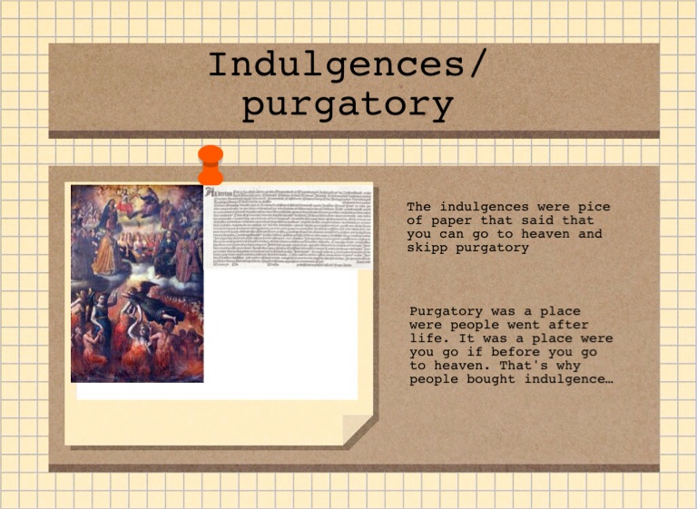 Purgatory was a place were people went after life. It was a place were you go if before you go to heaven. That's why people bought indulgences.
