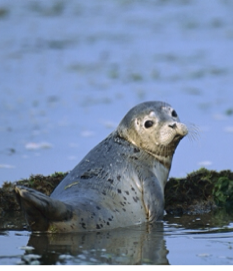 Seals eat fish, crab, and squid.their predators are humans, sharks, and killer whales.