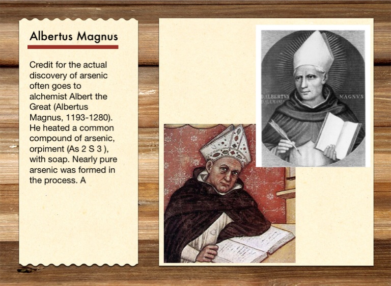 Credit for the actual discovery of arsenic often goes to alchemist Albert the Great (Albertus Magnus, 1193-1280). He heated a common compound of arsenic, orpiment (As 2 S 3 ), with soap. Nearly pure arsenic was formed in the process. A