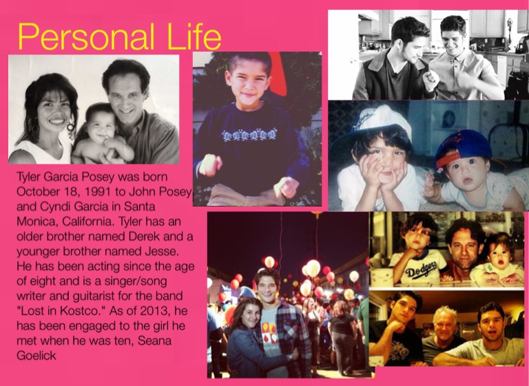 Tyler Garcia Posey was born October 18, 1991 to John Posey and Cyndi Garcia in Santa Monica, California. Tyler has an older brother named Derek and a younger brother named Jesse. He has been acting since the age of eight and is a singer/song writer and guitarist for the band "Lost in Kostco." As of 2013, he has been engaged to the girl he met when he was ten, Seana Goelick