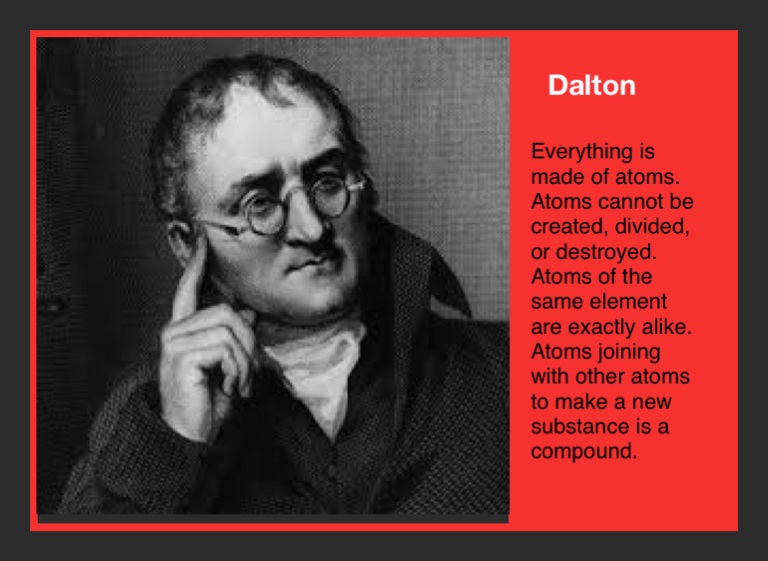 Everything is made of atoms. Atoms cannot be created, divided, or destroyed. Atoms of the same element are exactly alike. Atoms joining with other atoms to make a new substance is a compound.