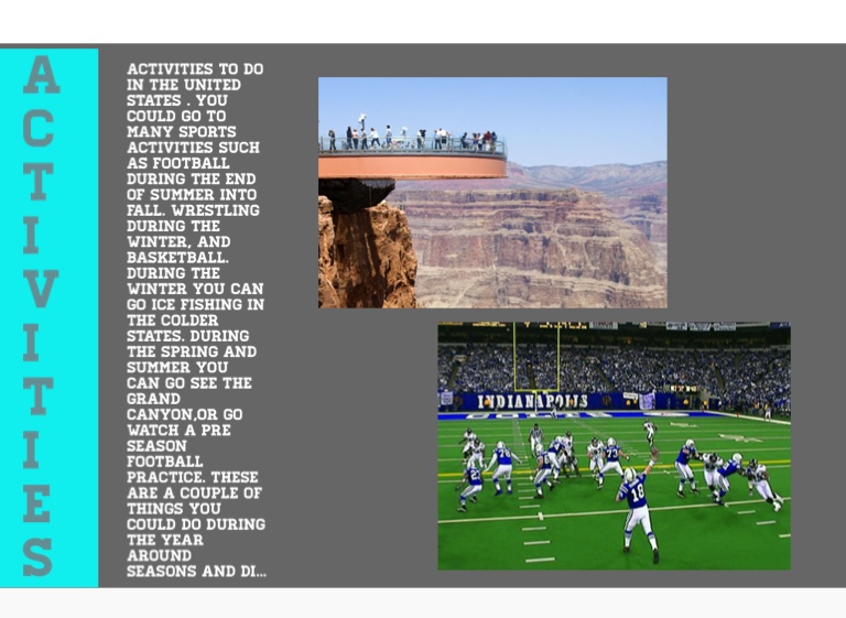 Activities to do in the United States . You could go to many sports activities such as football during the end of summer into fall. Wrestling during the winter, and basketball. During the winter you can go ice fishing in the colder states. During the spring and summer you can go see the Grand Canyon,or go watch a pre season football practice. These are a couple of things you could do during the year around seasons and different climates.