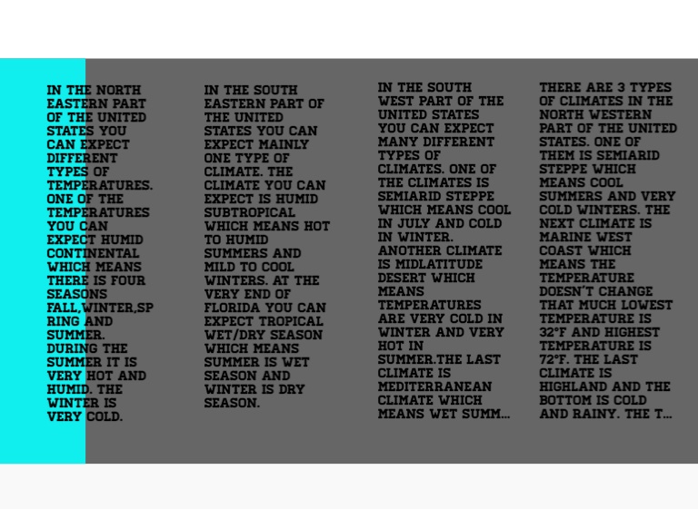 There are 3 types of climates in the north western part of the United States. One of them is semiarid steppe which means cool summers and very cold winters. The next climate is Marine west coast which means the temperature doesn't change that much lowest temperature is 32°F and highest temperature is 72°f. The last climate is highland and the bottom is cold and rainy. The top is snowy and freezing cold.