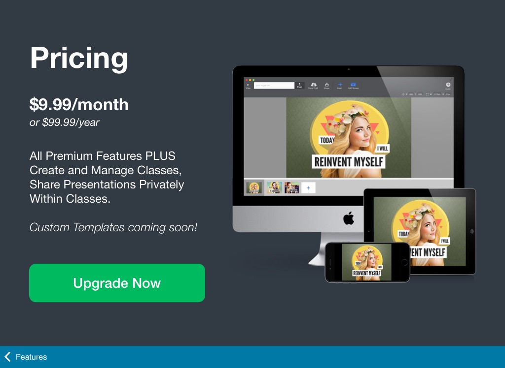 All Premium Features PLUS Create and Manage Classes, Share Presentations Privately Within Classes.