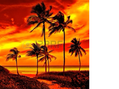 A picture of a sunset on a tropical shore.