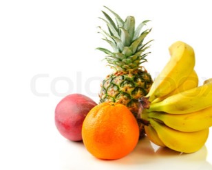 Fruits that are commonly found in the tropics such as pineapple, apple, orange and banana.