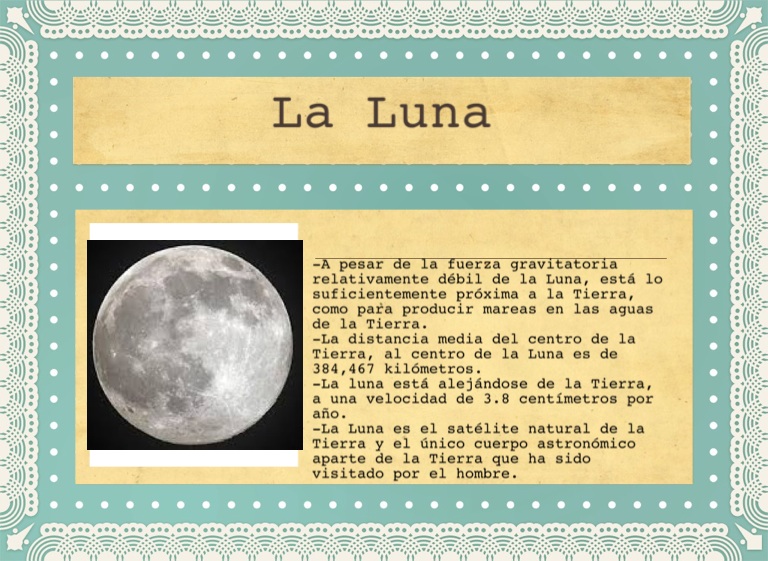 -La Luna es el satélite natural de la Tierra y el único cuerpo astronómico aparte de la Tierra que ha sido visitado por el hombre.