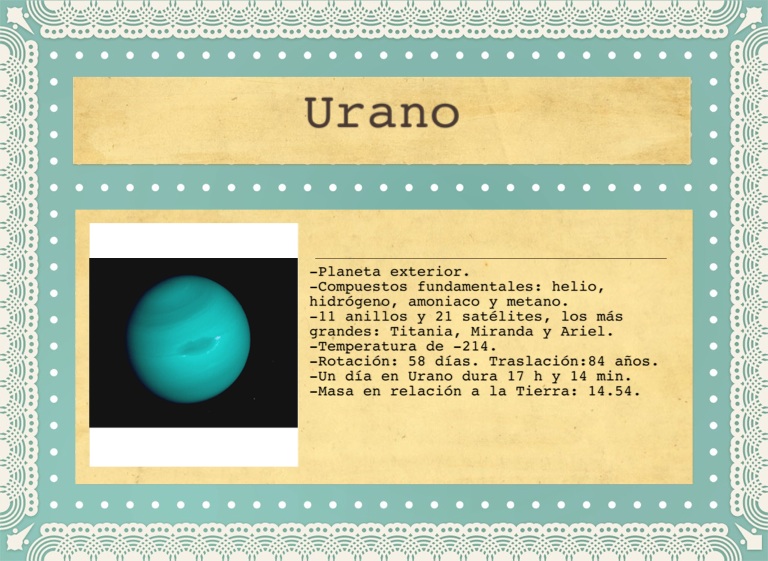 -11 anillos y 21 satélites, los más grandes: Titania, Miranda y Ariel.
