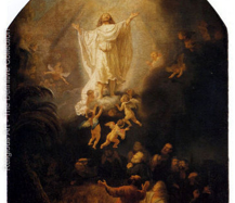Describe: Jesus rising to heaven. Angels surround him, lifting him up. People stand at the ground, astounded at what they are seeing. Jesus is bathed in golden light.