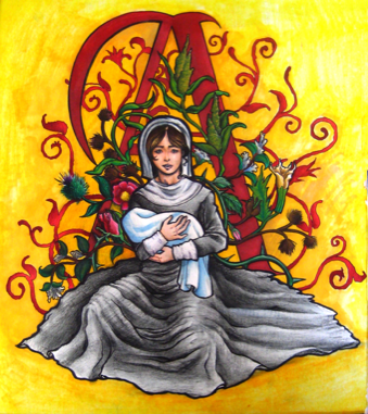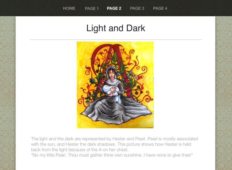 The light and the dark are represented by Hester and Pearl. Pearl is mostly associated with the sun, and Hester the dark shadows. This picture shows how Hester is held back from the light because of the A on her chest.