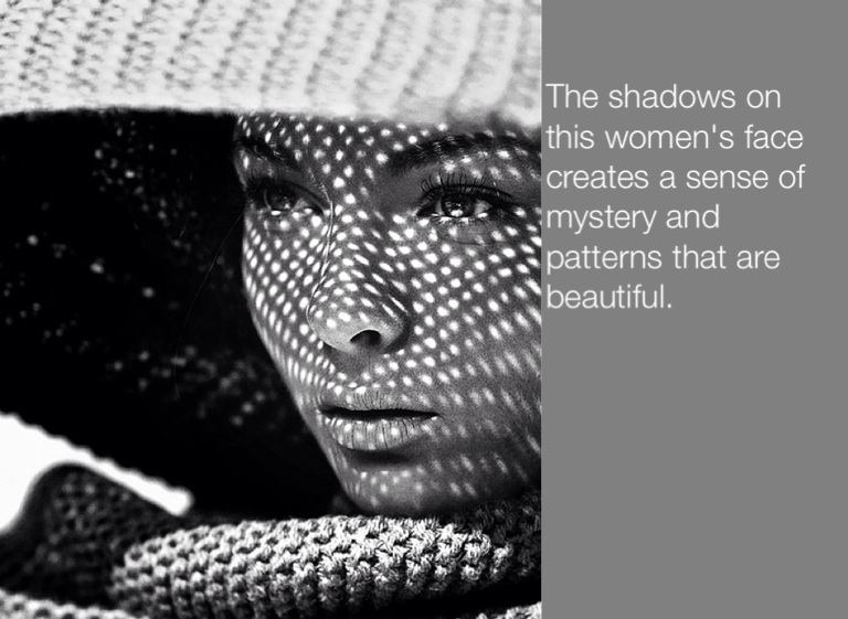 The shadows on this women's face creates a sense of mystery and patterns that are beautiful.