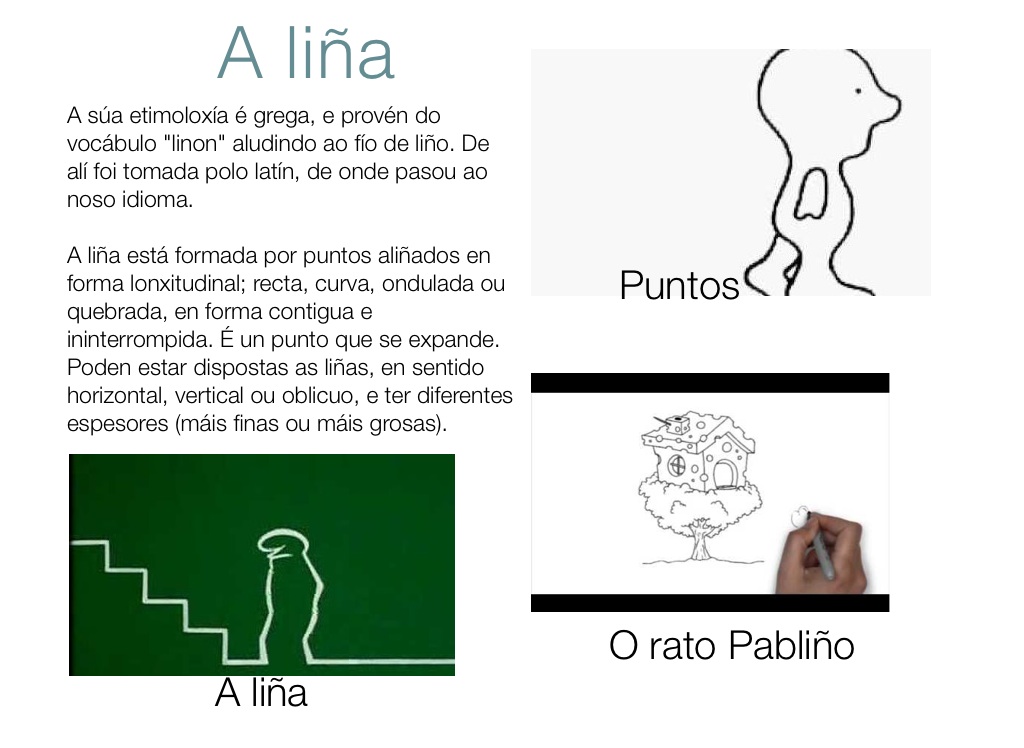 A liña está formada por puntos aliñados en forma lonxitudinal; recta, curva, ondulada ou quebrada, en forma contigua e ininterrompida. É un punto que se expande. Poden estar dispostas as liñas, en sentido horizontal, vertical ou oblicuo, e ter diferentes espesores (máis finas ou máis grosas).