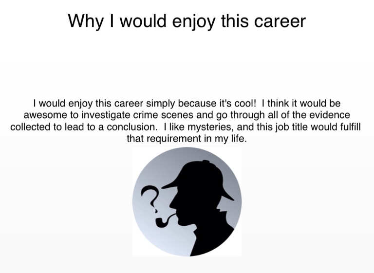 I would enjoy this career simply because it's cool! I think it would be awesome to investigate crime scenes and go through all of the evidence collected to lead to a conclusion. I like mysteries, and this job title would fulfill that requirement in my life.