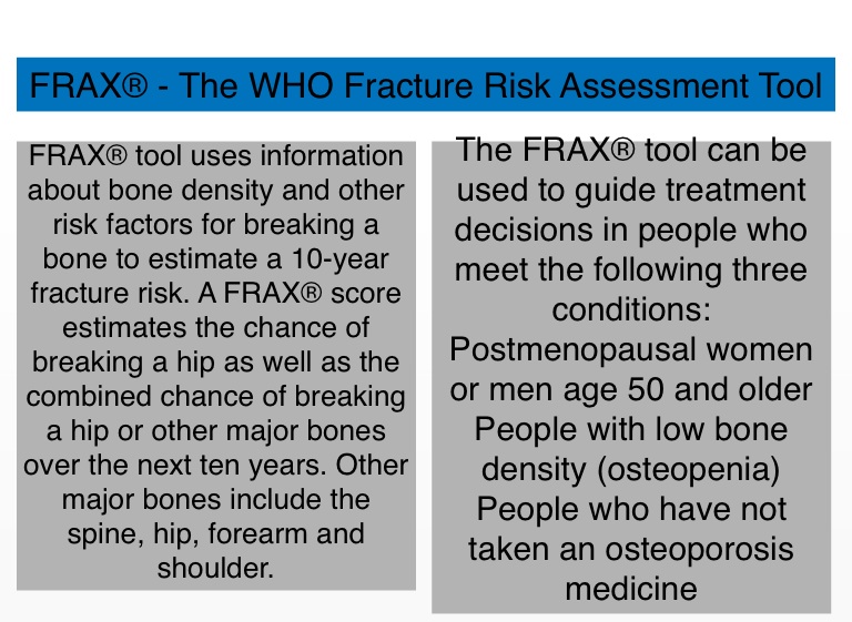 FRAX® tool uses information about bone density and other risk factors for breaking a bone to estimate a 10-year fracture risk. A FRAX® score estimates the chance of breaking a hip as well as the combined chance of breaking a hip or other major bones over the next ten years. Other major bones include the spine, hip, forearm and shoulder.
