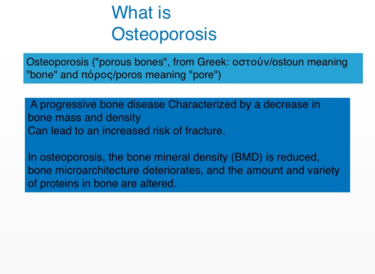 Osteoporosis ("porous bones", from Greek: οστούν/ostoun meaning "bone" and πόρος/poros meaning "pore")
