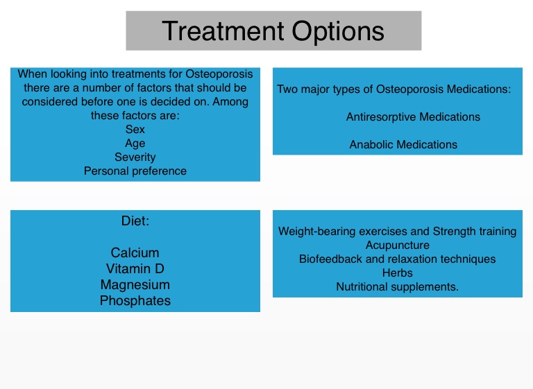 When looking into treatments for Osteoporosis there are a number of factors that should be considered before one is decided on. Among these factors are: