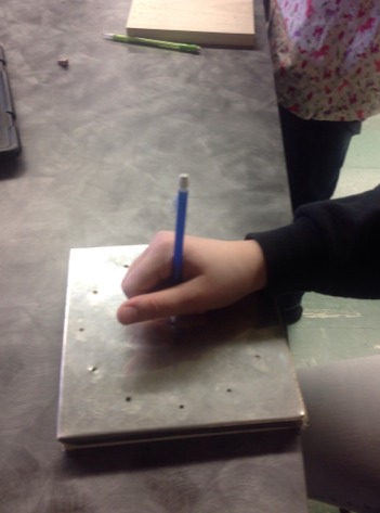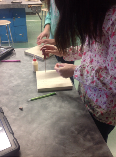 The template is being traced and holes are being punched to guided the drill where to drill.
