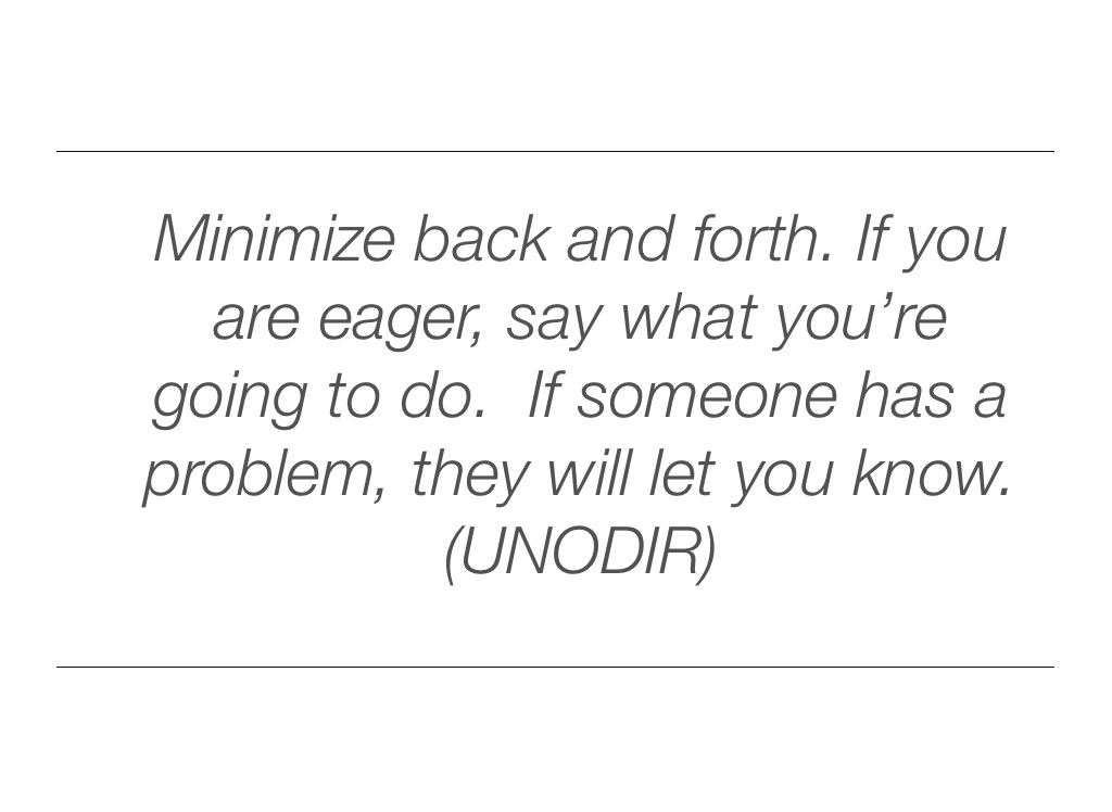 Minimize back and forth. If you are eager, say what you’re going to do. If someone has a problem, they will let you know. (UNODIR)