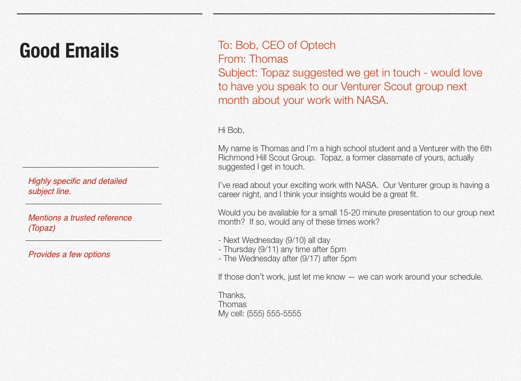 I’ve read about your exciting work with NASA. Our Venturer group is having a career night, and I think your insights would be a great fit.